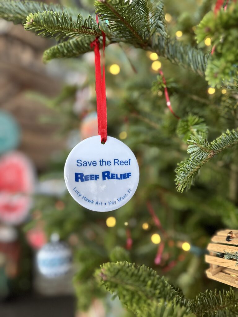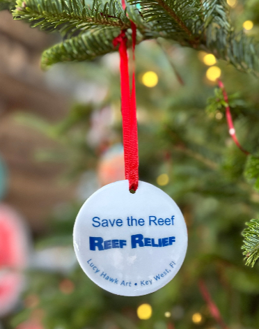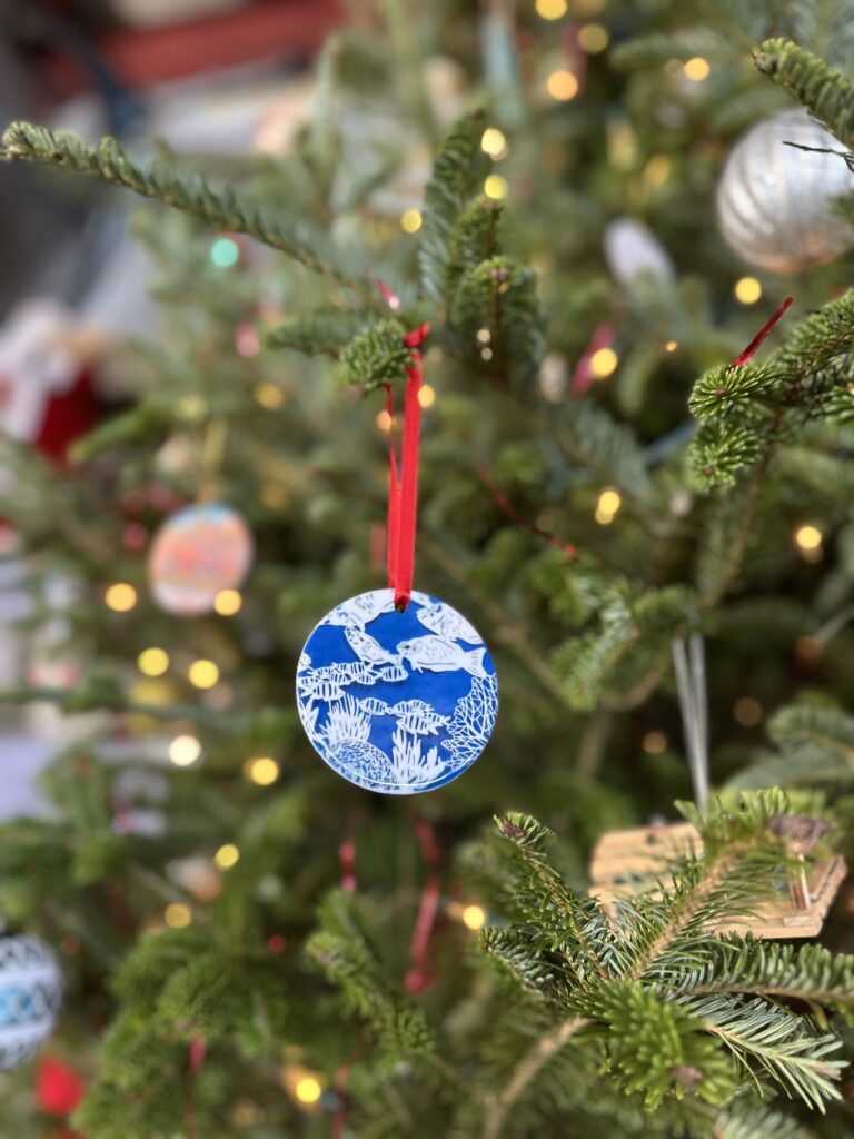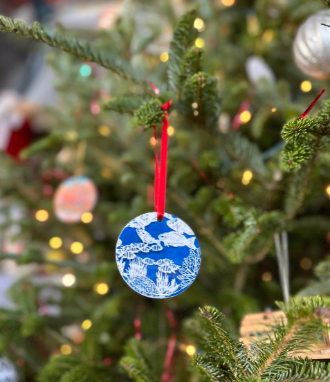 “The Reef” paper print designed by Lucy Hawk Art printed on a ceramic ornament.