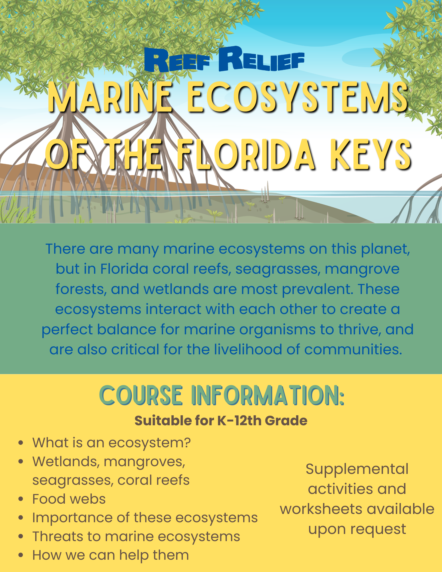 Reef Relief provides free marine science lessons to teachers with groups of 10 or more learners aged preK-12th grade. These lessons are offered virtually (worldwide) or in person (Monroe County, FL ONLY), consisting of a live presentation, optional activities to further their knowledge on the subject, and a Q&A session with one of Reef Relief’s experienced educators. Lessons are designed to support the current curriculum and satisfy numerous state standards. Since 2013, this program has reached over 80,000 students. For more information please see below, or email [email protected].
