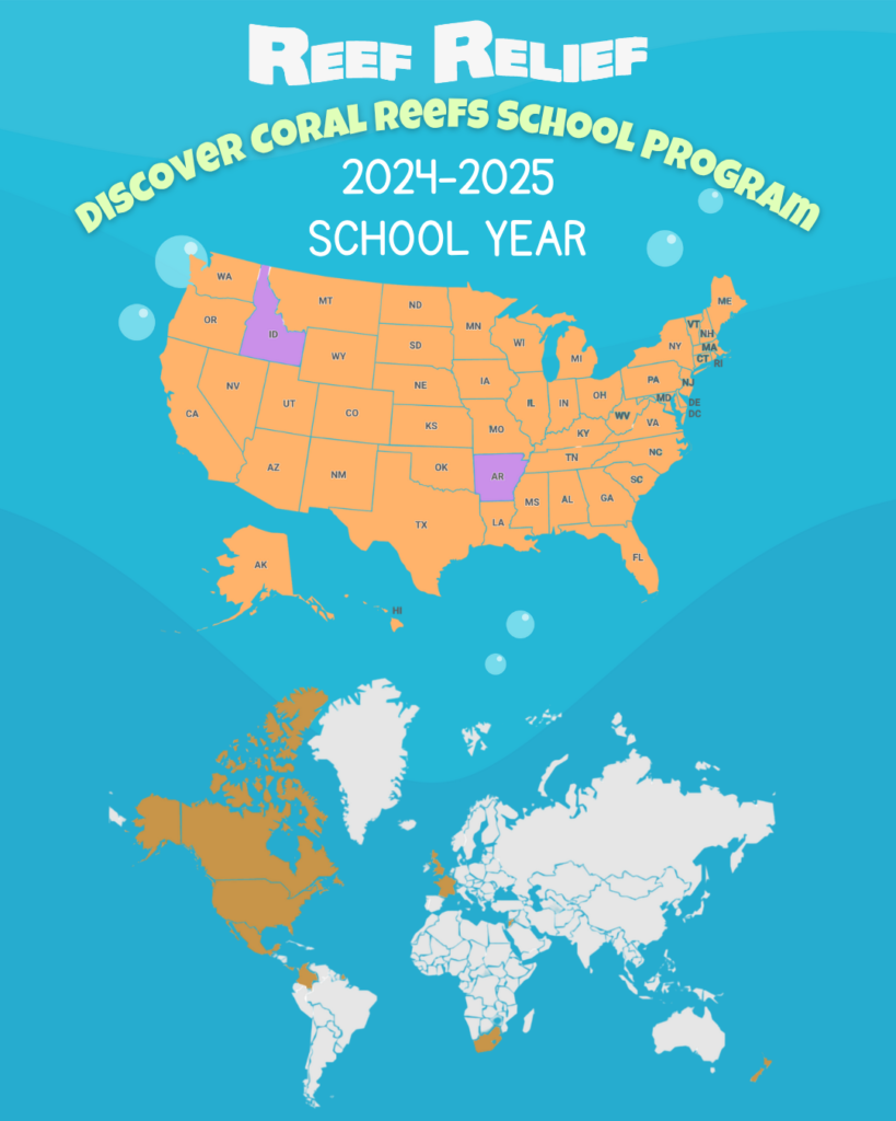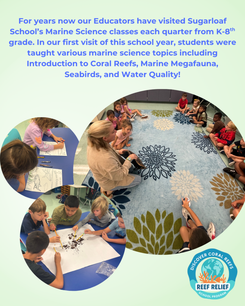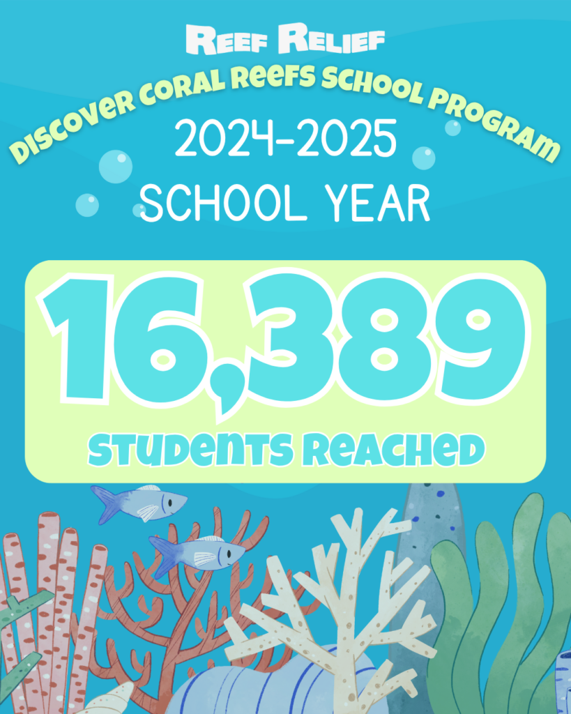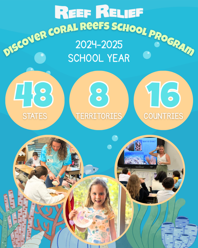 The Discover Coral Reefs School Program is presented to students in Pre-K-12th grades. Classes are available to public schools, private schools, and homeschool groups, and are offered virtually (worldwide) or in person (throughout Monroe County, FL and selectively in South Florida). Lessons cover various marine science topics and consist of a live presentation, optional activities to further student knowledge on the subject, and a live Q&A session with one of Reef Relief’s experienced educators. Classroom lessons are designed to support current curriculum and satisfy Florida State Standards and continually expand to suit the needs of each class. Interested teachers can decide the topic or lesson type they would like to have for their class, and sessions can be scheduled throughout the school year, with the option to participate in multiple days of lessons so students may learn about different marine science topics. There is no cost to participate in this program. Since 2013, this program has reached over 90,000 students. For more information please see below, or email [email protected].
