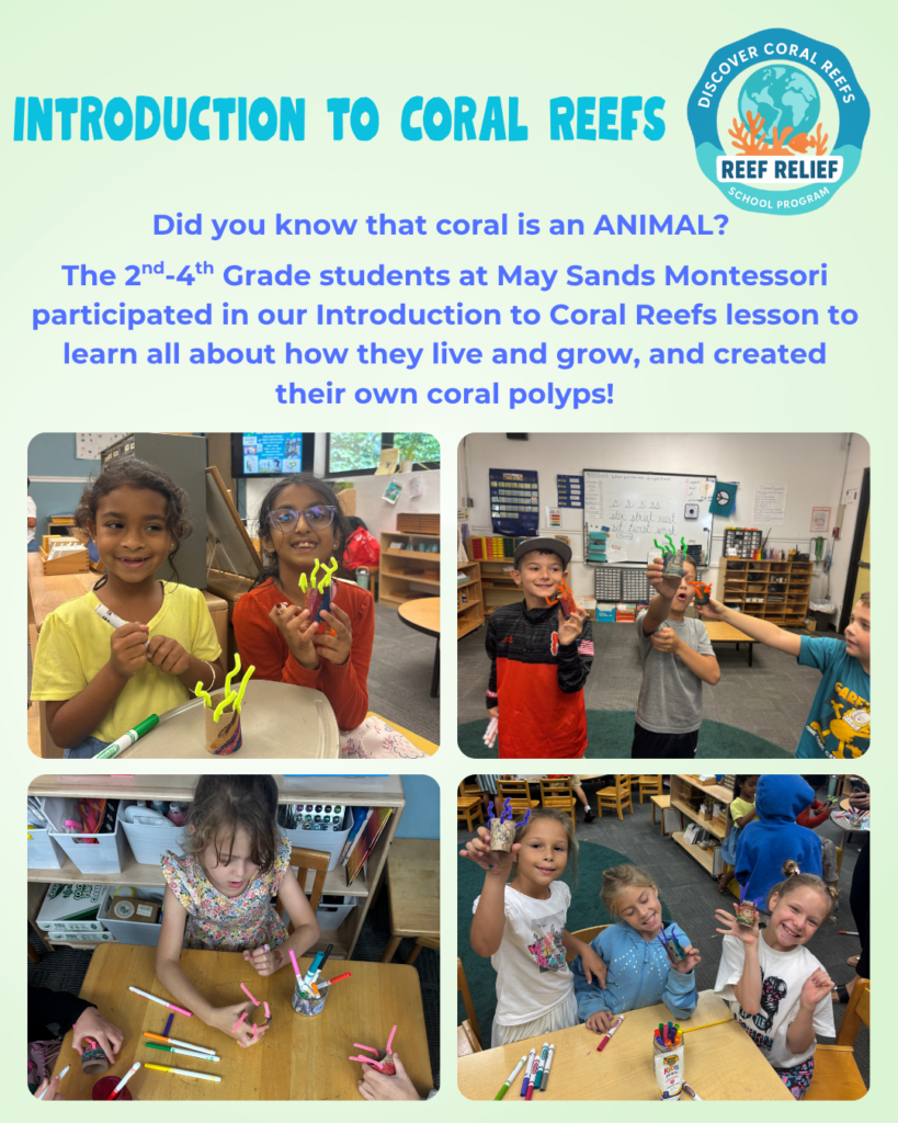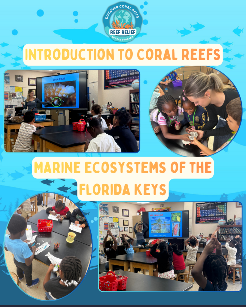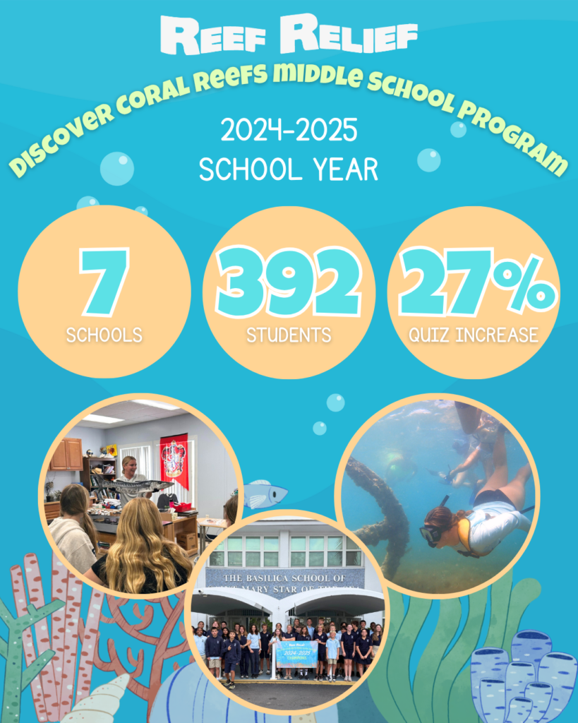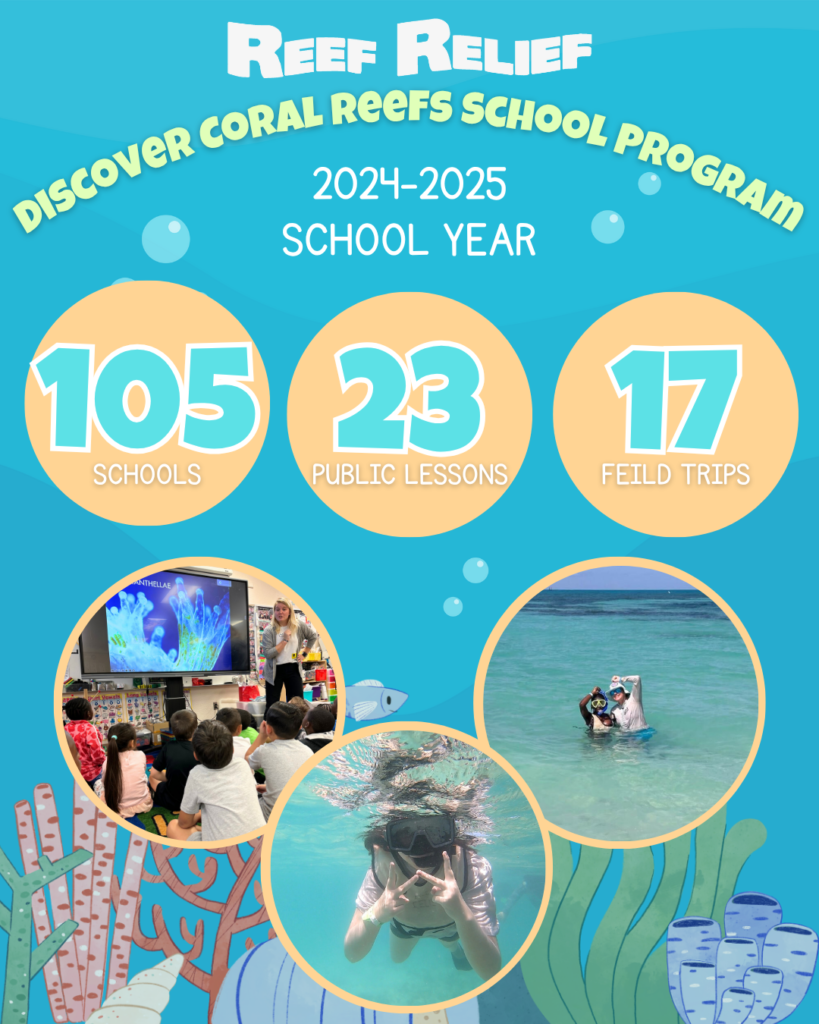 The Discover Coral Reefs School Program is presented to students in Pre-K-12th grades. Classes are available to public schools, private schools, and homeschool groups, and are offered virtually (worldwide) or in person (throughout Monroe County, FL and selectively in South Florida). Lessons cover various marine science topics and consist of a live presentation, optional activities to further student knowledge on the subject, and a live Q&A session with one of Reef Relief’s experienced educators. Classroom lessons are designed to support current curriculum and satisfy Florida State Standards and continually expand to suit the needs of each class. Interested teachers can decide the topic or lesson type they would like to have for their class, and sessions can be scheduled throughout the school year, with the option to participate in multiple days of lessons so students may learn about different marine science topics. There is no cost to participate in this program. Since 2013, this program has reached over 90,000 students. For more information please see below, or email [email protected].