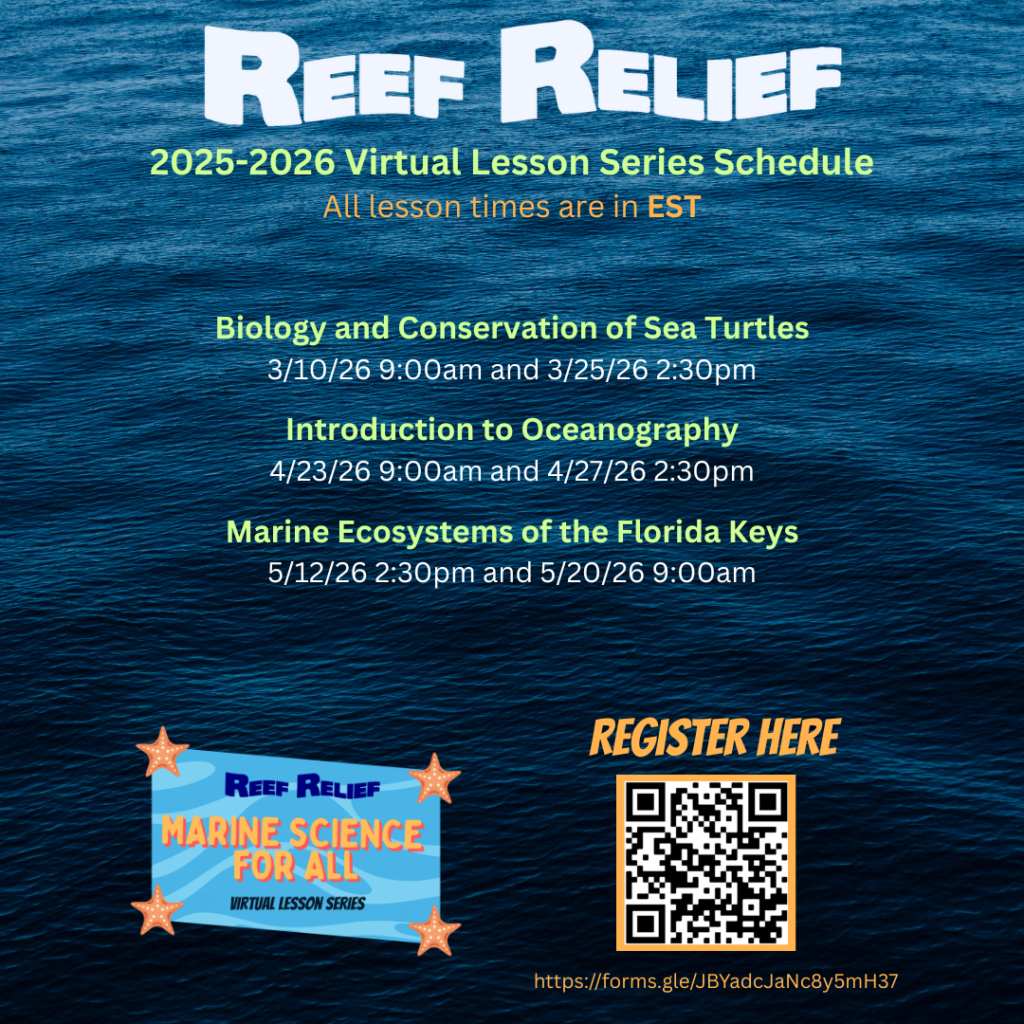 As part of our Marine Science for All Initiative, Reef Relief offers free virtual marine science lessons held via zoom to the public several times each month throughout the school year. These lessons are ideal for individuals, homeschoolers, homeschool groups, and smaller groups, but are open to classrooms and larger groups as well. These lessons are approximately 45 minutes-1 hour live.
